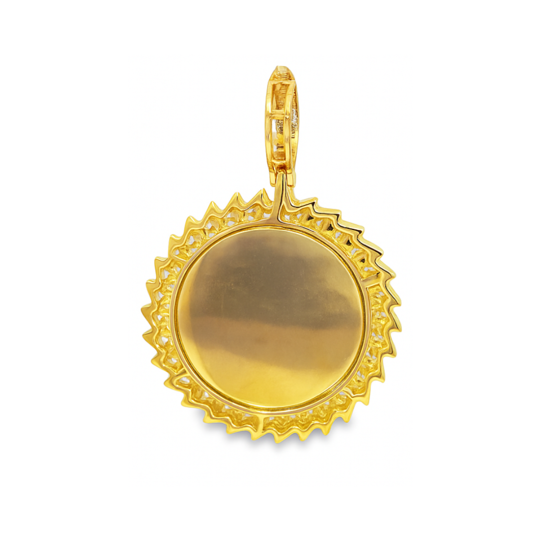 Hold treasured moments close with this round diamond frame memory pendant crafted in 10K yellow gold. A circle of sparkling diamonds outlines the frame, offering clean symmetry and understated brilliance.